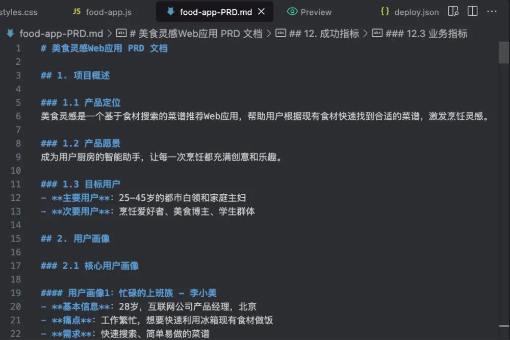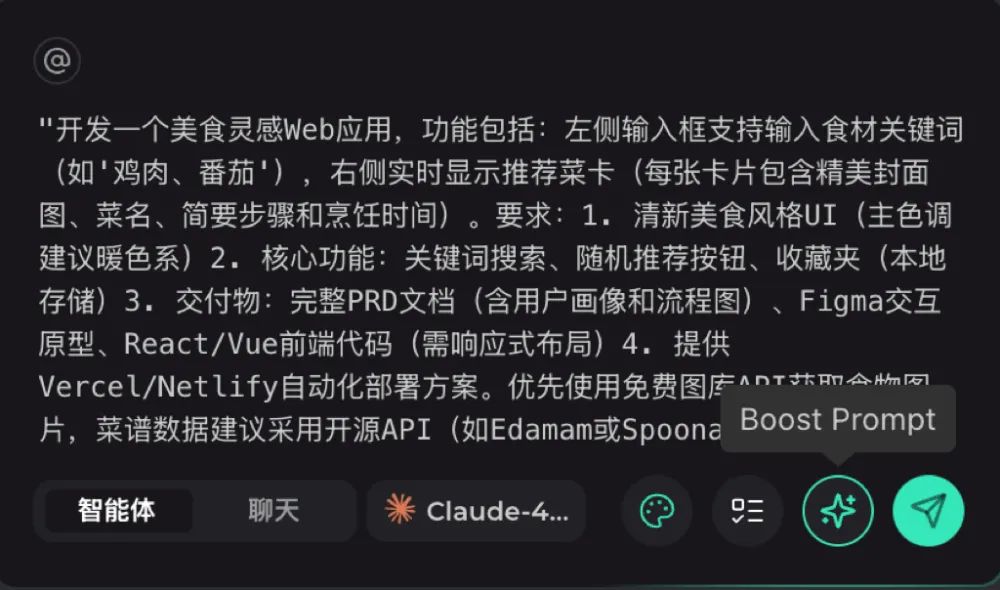 输入的初始提示词为:“帮我开发一个美食灵感Web应用,左侧输入食材关键词,右侧生成带封面图片和简要菜谱的推荐卡片,页面风格清爽美食感,支持随机推荐、收藏功能,生成完整PRD、交互稿、可运行前端代码并部署上线。”